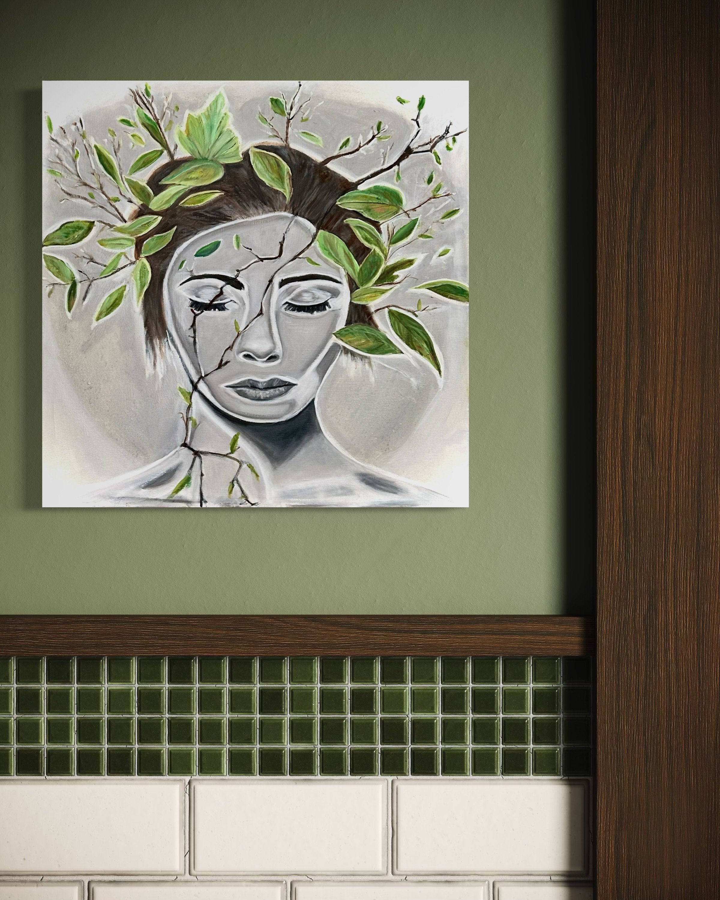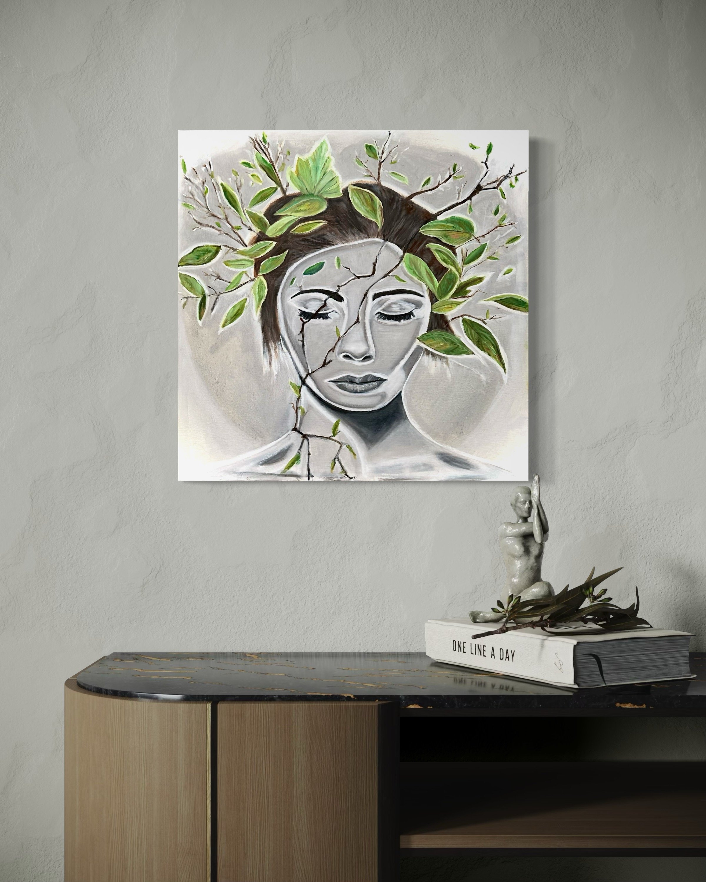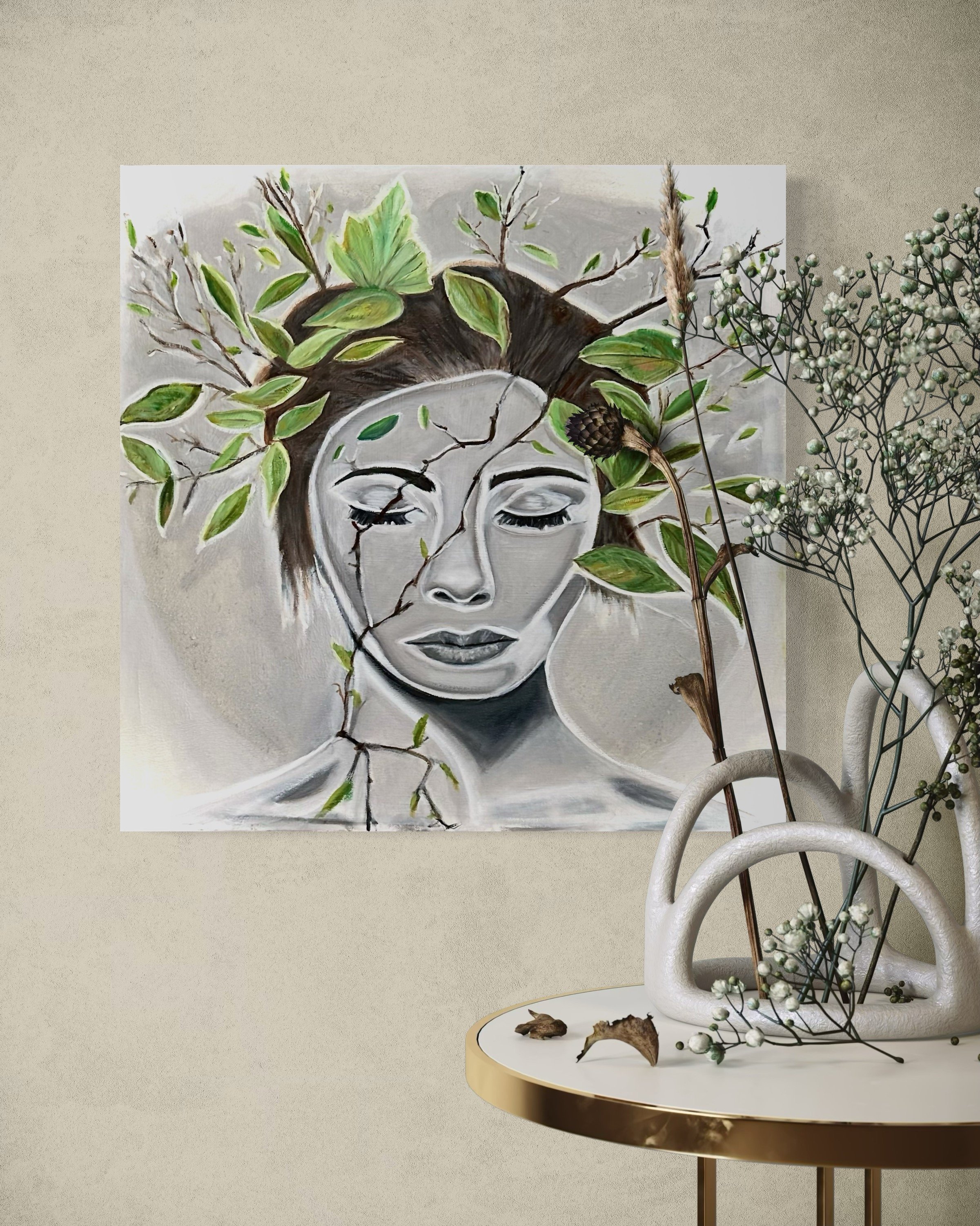 Cognition #3 depicts the mind as a blend of organic form and industrial mechanics. The portrait’s cool, sculptural tones contrast with warm, intricate gears, symbolizing the complex, quiet workings of thought. This piece invites reflection on the structure and motion behind our mental processes.
