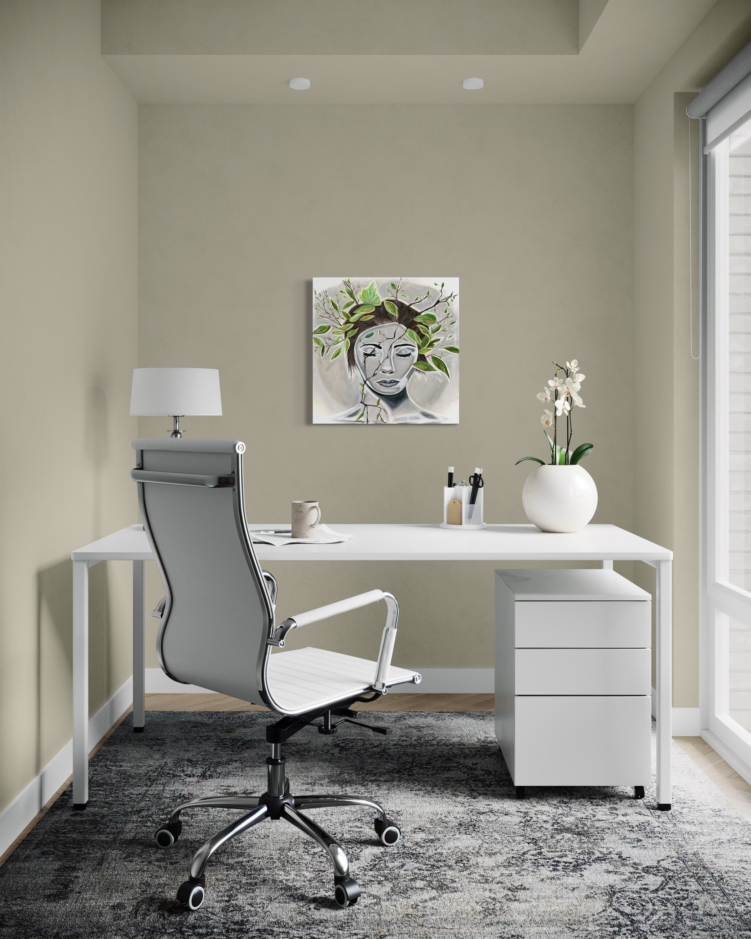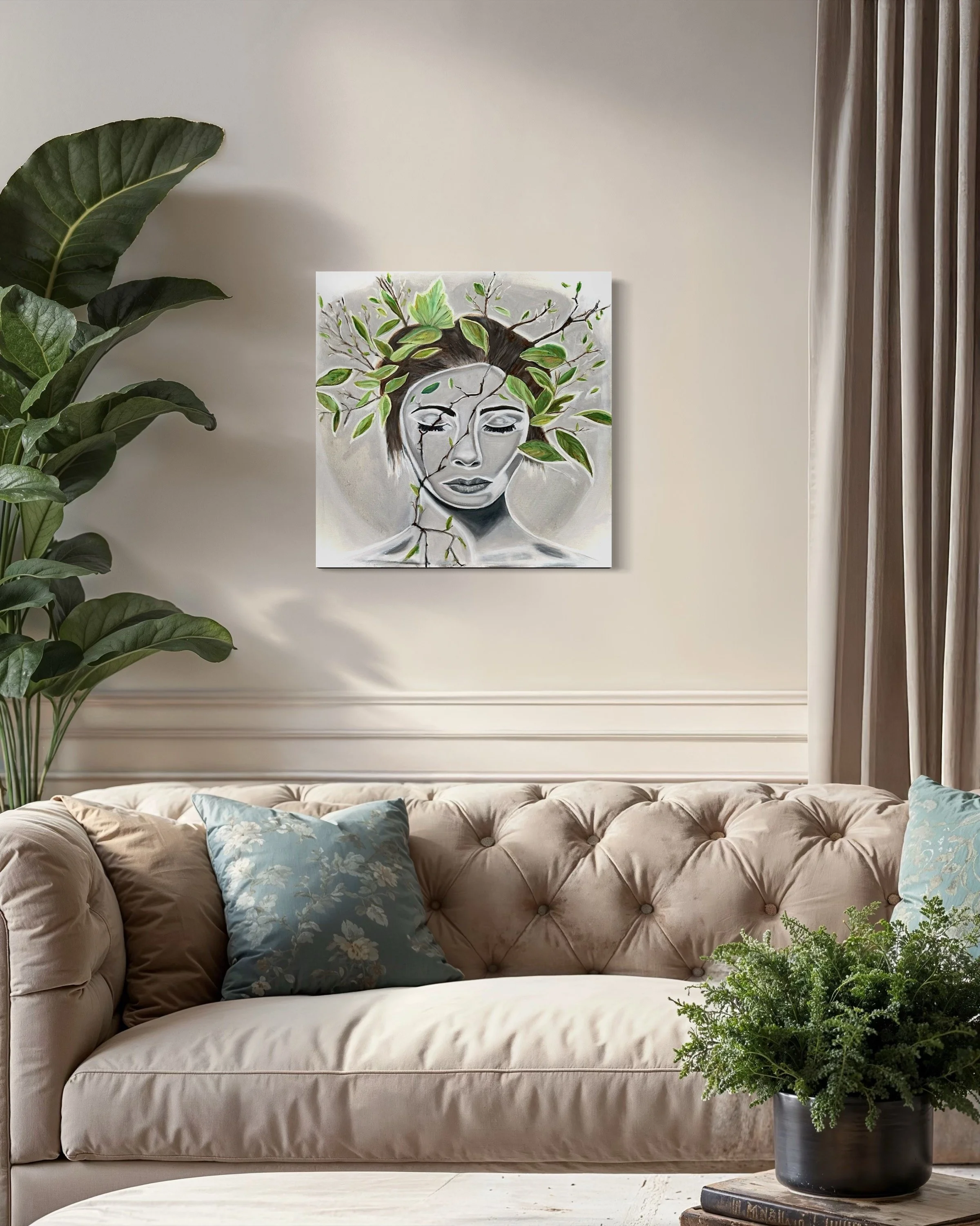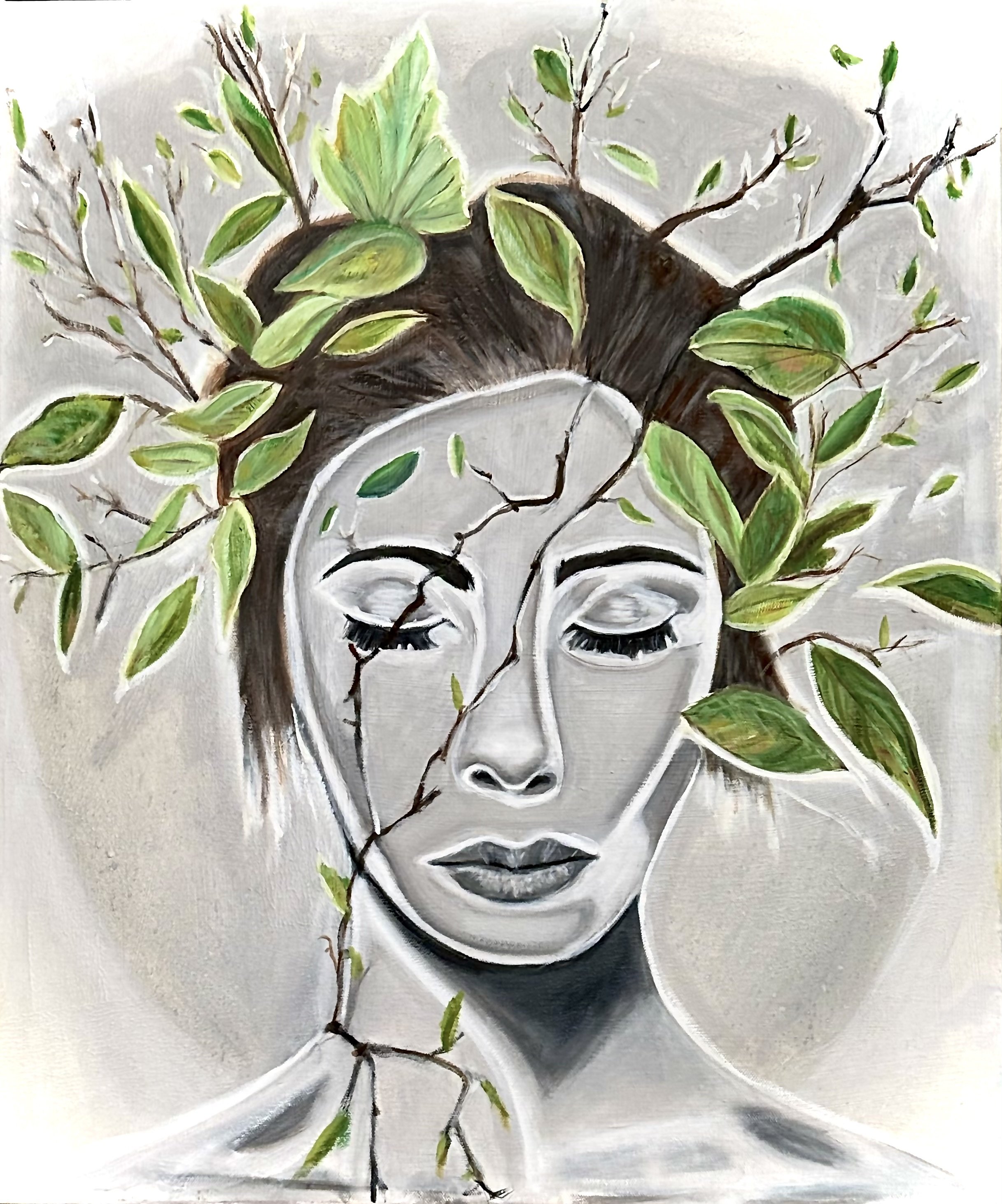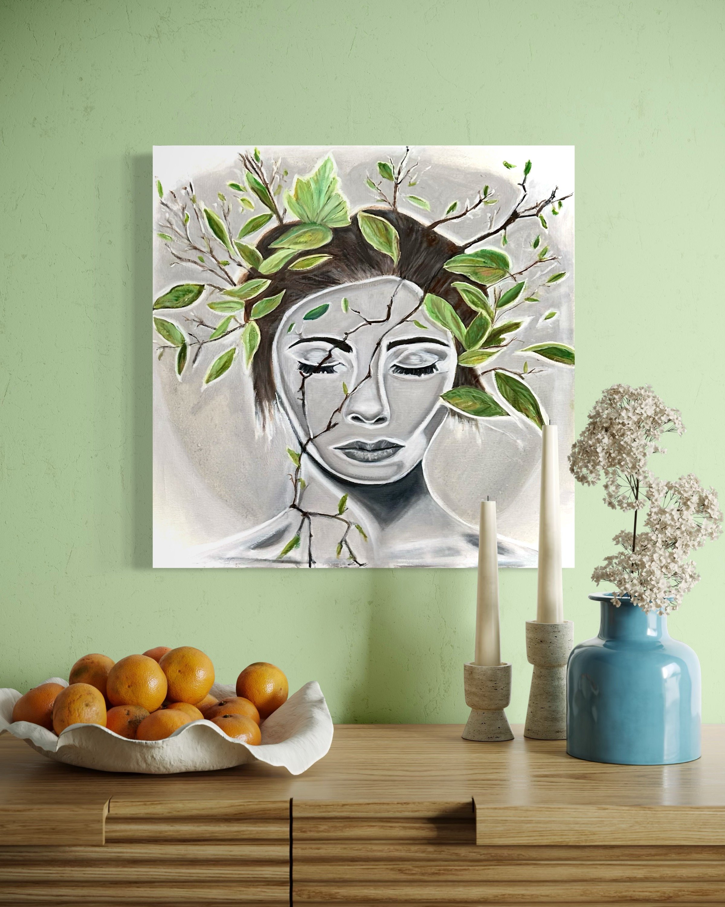 Cognition #3 depicts the mind as a blend of organic form and industrial mechanics. The portrait’s cool, sculptural tones contrast with warm, intricate gears, symbolizing the complex, quiet workings of thought. This piece invites reflection on the structure and motion behind our mental processes.